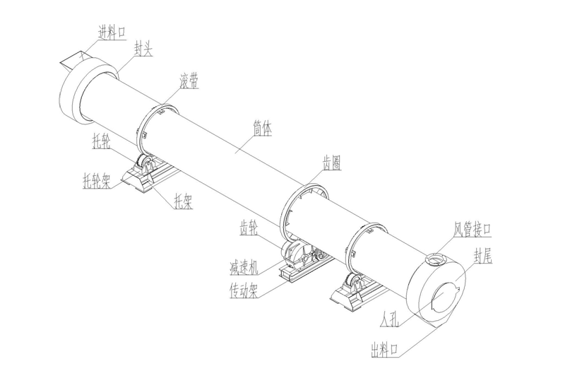 d.封頭、封尾、風(fēng)管、火管:該部分構(gòu)成了烘干機工作中所需的熱風(fēng)循環(huán)、除塵系統(tǒng)。封頭、封尾與機體接合處之間密封性良好,從而使熱風(fēng)不斷地帶走顆粒中所含的水分,達(dá)到均勻烘干顆粒的目的。操作人員需要進入筒體內(nèi)部進行作業(yè)時,請在停機情況下由檢修孔進入。